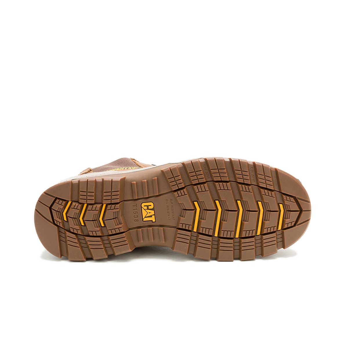 PROTECCIÓN DE PUNTERA DE ACERO La opción de puntera de seguridad más confiable con acero de alta resistencia. Primer plano del zapato desde atrás. TRACCIÓN INCONFUNDIBLE. Una suela inspirada en los neumáticos de la maquinaria Cat® proporciona una pisada segura en cualquier terreno. Primer plano lateral ampliado. PROTECCIÓN IMPERMEABLE. El cuero impermeable y la membrana transpirable mantienen los pies secos en ambientes húmedos.